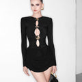 The Aura Draped Mini Dress embodies effortless glamour and sculpted confidence. Featuring a daring front cut-out design accentuated by bold gold clasps, this piece merges artful structure with modern sensuality. The draped hip detailing adds fluid movement, while the long sleeves and clean neckline keep it timelessly elegant.