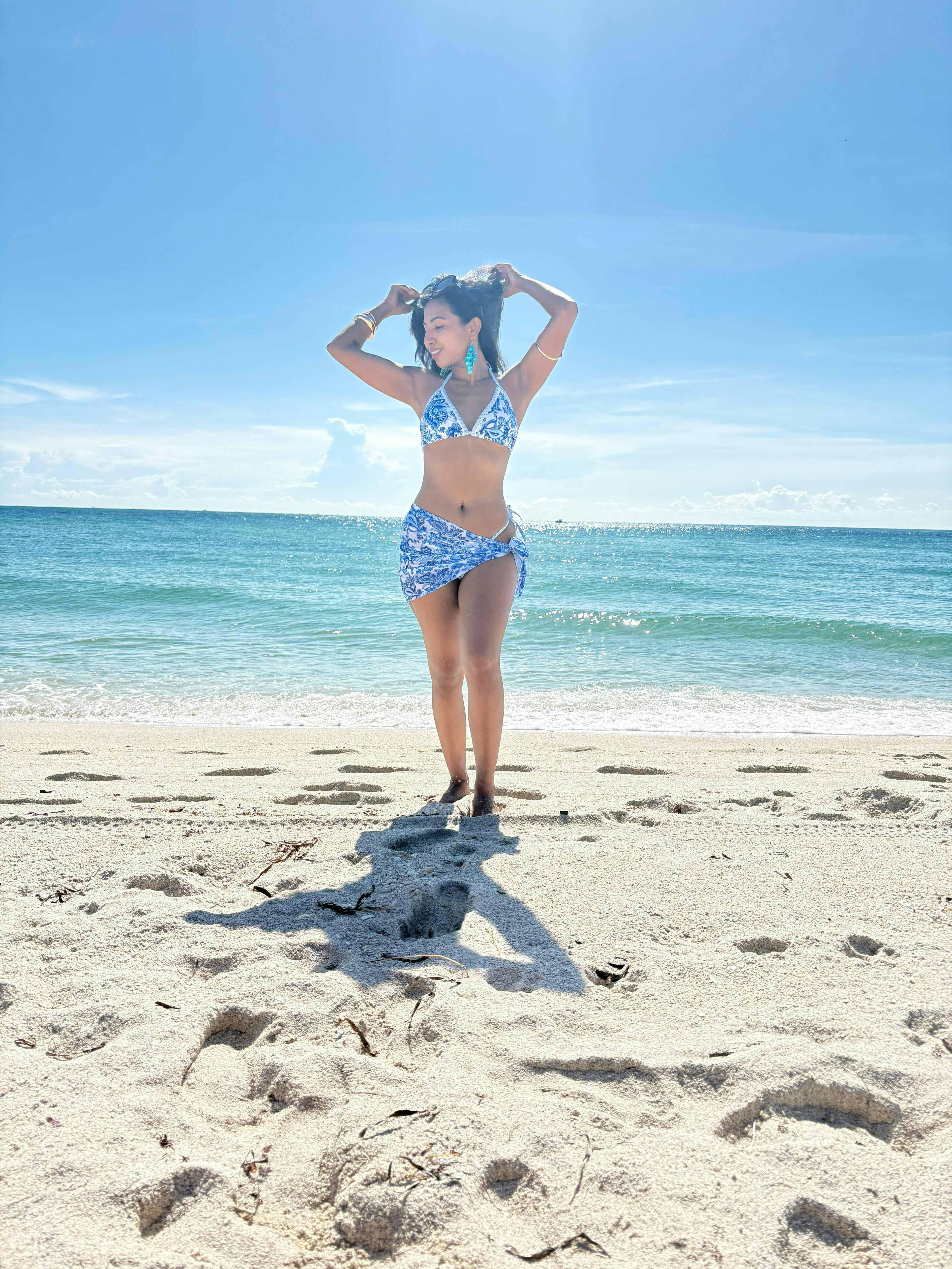 Bring coastal elegance to your summer wardrobe with this stunning blue and white bikini set. Featuring a delicate halter-neck tie and adjustable bottoms for the perfect fit, its intricate floral patterns evoke timeless Mediterranean charm. Complete with a lightweight matching sarong, this set is perfect for lounging poolside or strolling along the shore.