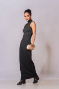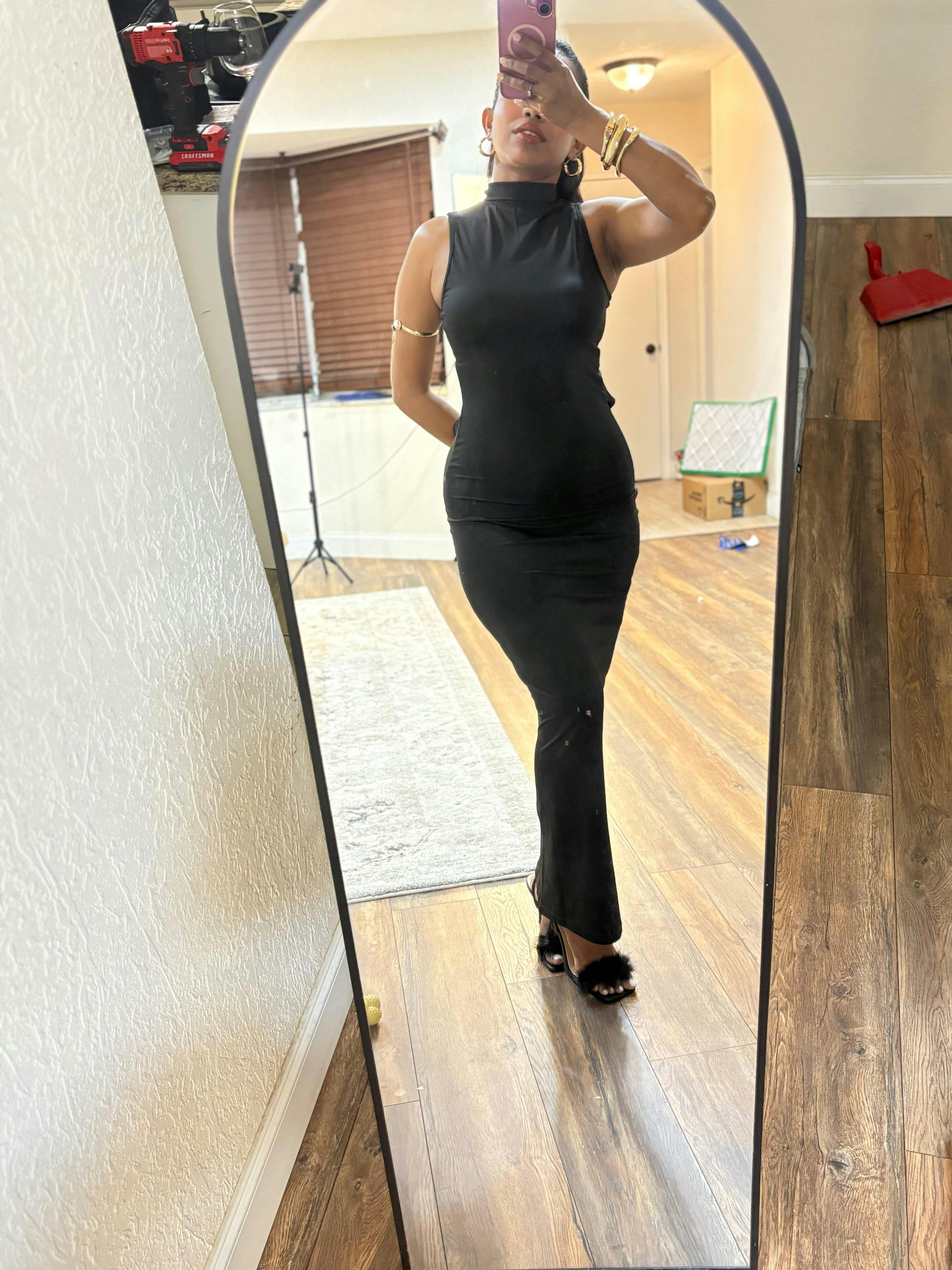 Minimalism meets bold sophistication in this sleek black maxi. Designed with a high neckline and a curve-hugging silhouette, it exudes understated elegance from the front. The statement cut-out back adds a daring edge, making it the perfect piece to transition from refined evenings to after-hours allure. Crafted to flatter, this dress pairs seamlessly with bold jewelry or a simple clutch for a timeless, elevated look.
