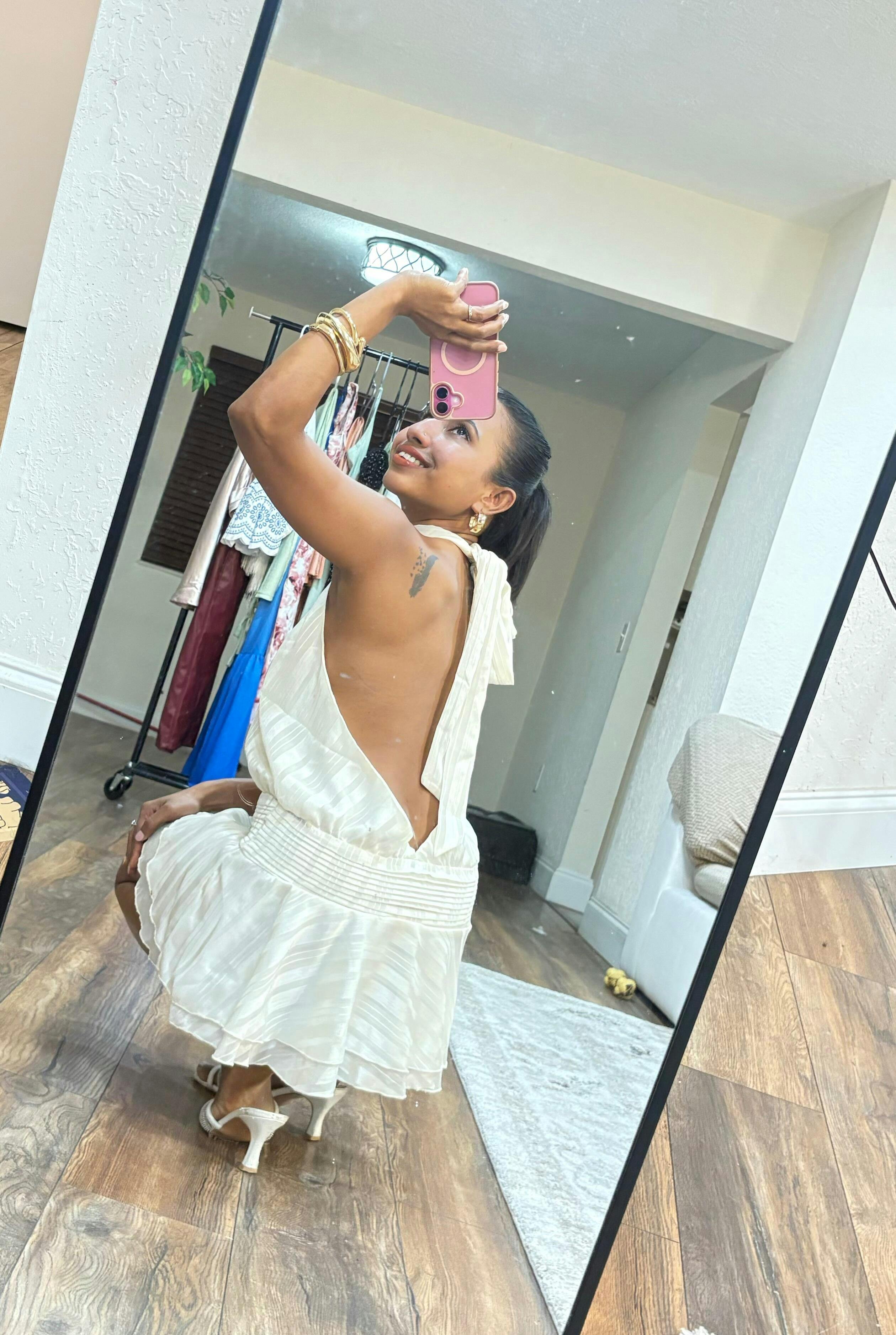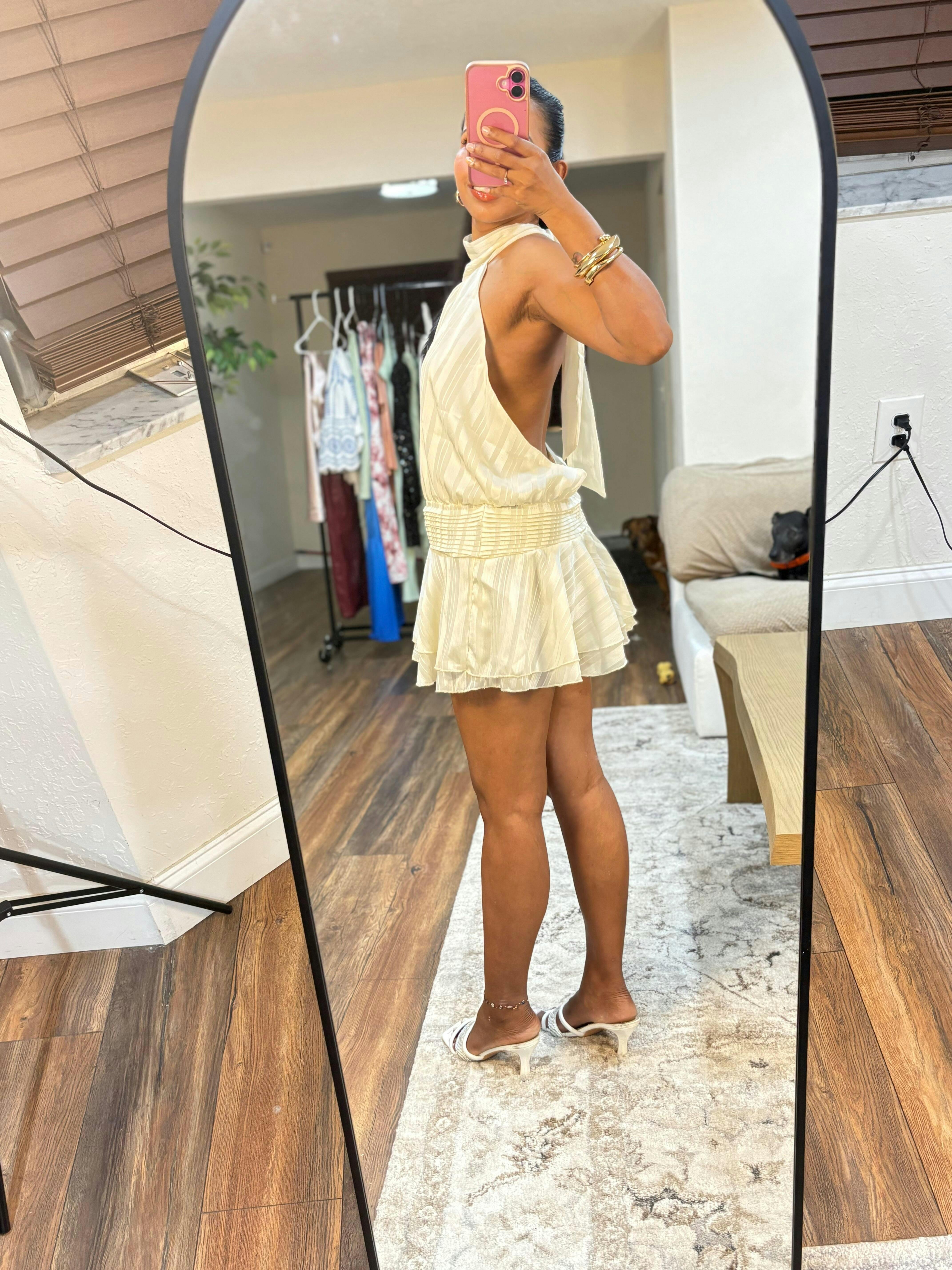 A luminous satin mini crafted with a soft halter neckline and elegant tie-back detail. The subtle sheen of the fabric enhances every movement, while the layered hem adds a touch of playful charm. Designed for evenings that call for effortless sophistication, this piece combines modern allure with timeless elegance.