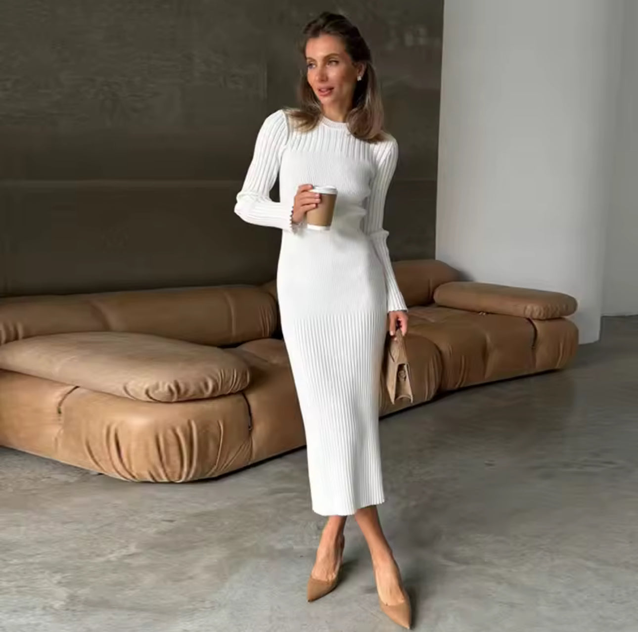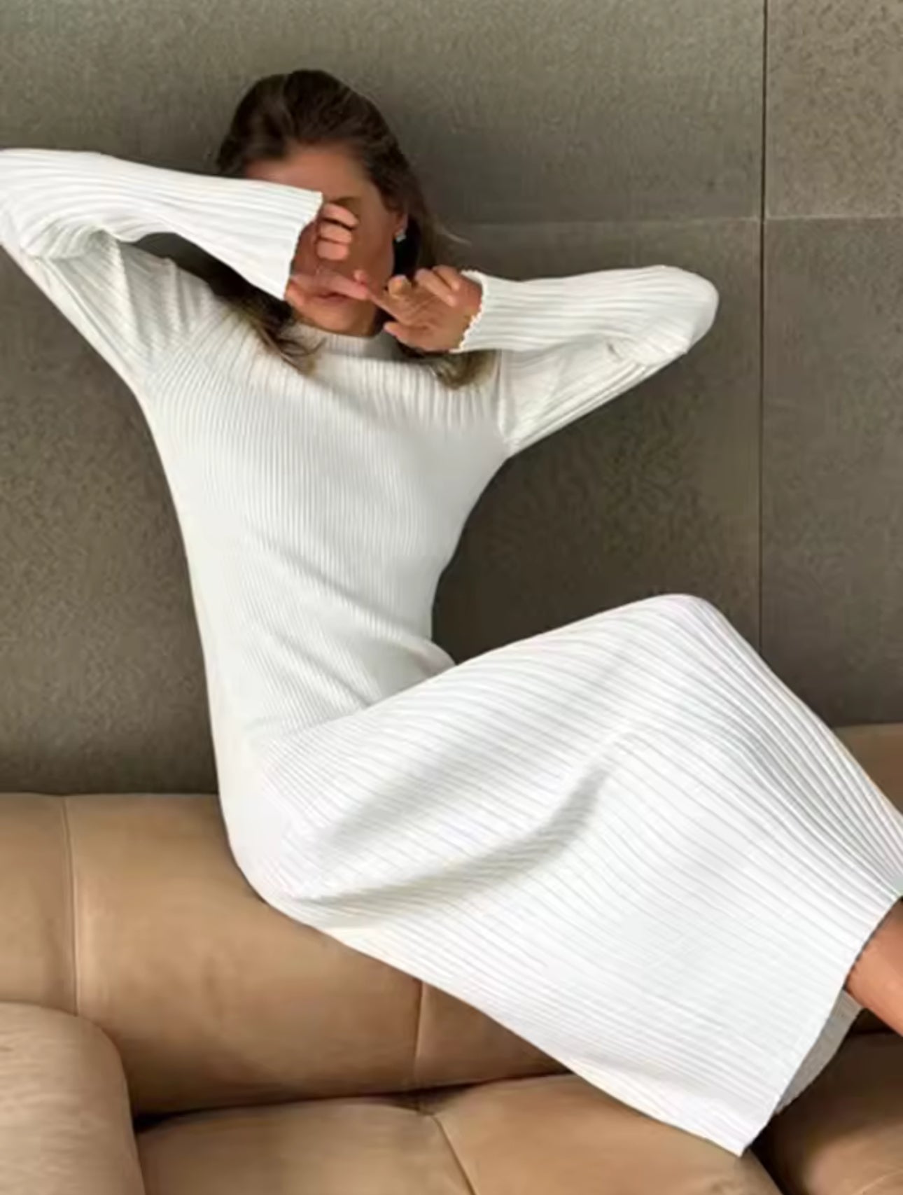 The Elysian Knit Dress captures effortless elegance in its purest form. Designed with a soft ribbed texture that flatters every curve, this minimalist silhouette transitions seamlessly from coffee mornings to candlelit evenings. Its full-length design and sculpting fit bring warmth, confidence, and understated allure to your winter wardrobe.