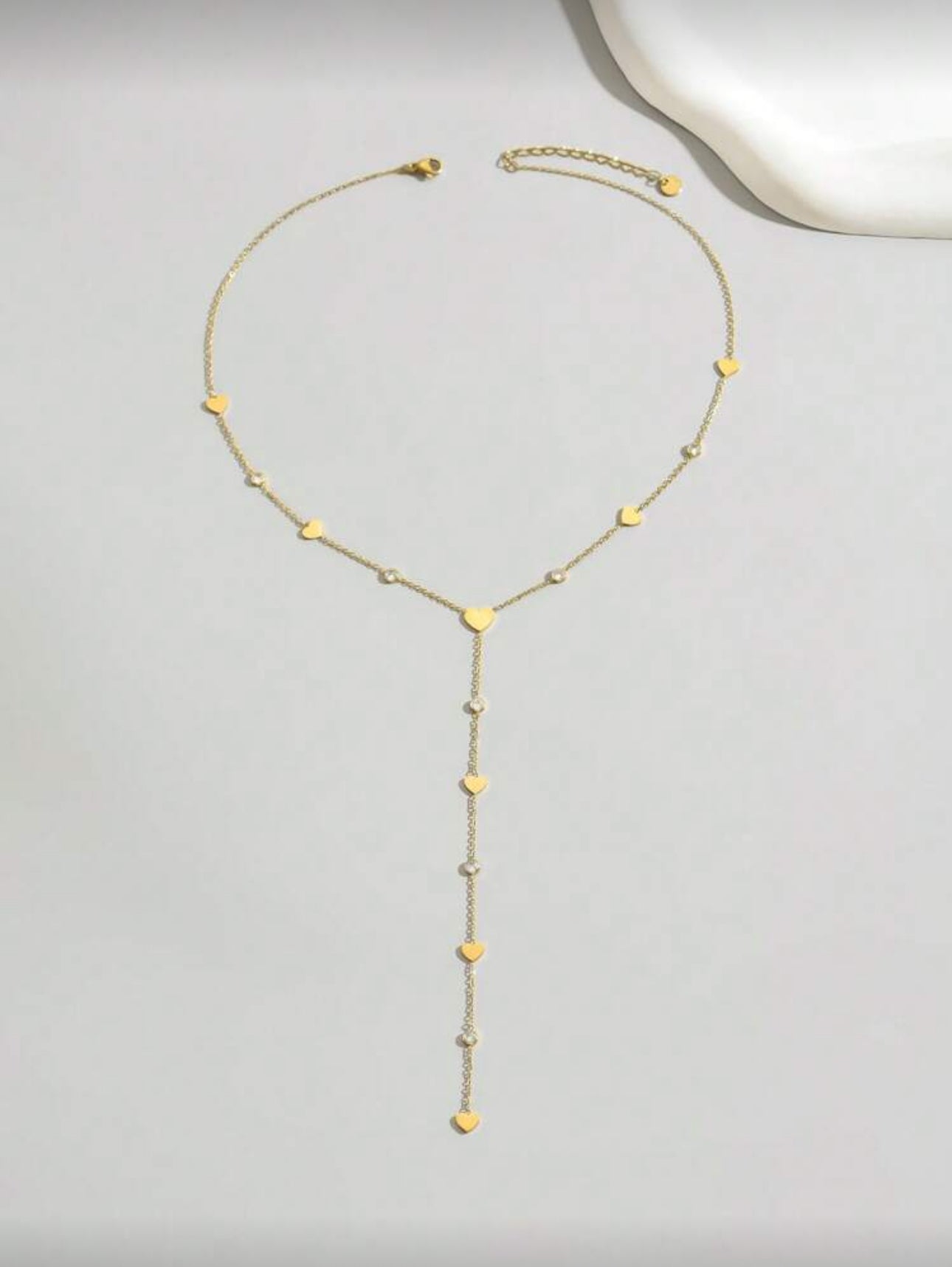 The Golden Heart Lariat Necklace embodies delicate romance and modern sophistication. Crafted with a fine gold chain adorned with mini heart charms and shimmering crystals, it gracefully drapes along the neckline, creating an elegant Y-shaped silhouette. Perfect for deep necklines or layered styling, this piece captures both simplicity and allure — a timeless statement of love and femininity.