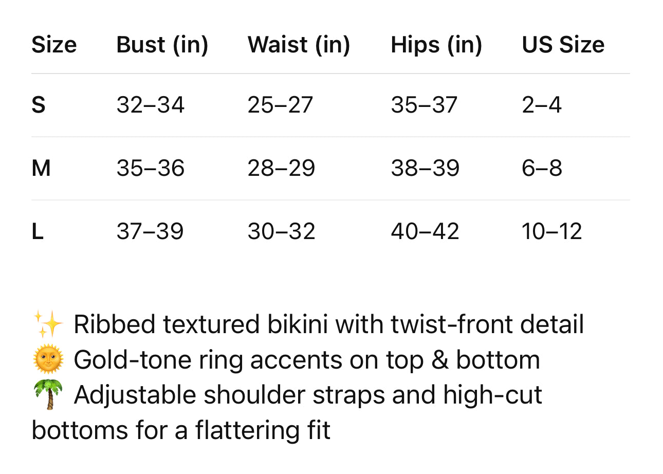 Radiate confidence in this striking golden-yellow bikini, designed with a flattering ribbed texture and bold ebony ring accents. The top features a supportive twist-front silhouette, while the high-cut bottoms elongate the legs and highlight natural curves. Perfect for sun-drenched getaways, this piece blends timeless elegance with modern edge — made for the woman who commands attention effortlessly.