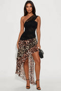 The Leopard Lace Gown embodies untamed elegance with a modern feminine edge. Designed with a sculpted one-shoulder lace bodice and a cascading leopard-print chiffon skirt, it moves with effortless grace and confidence. The asymmetrical hem adds a touch of drama, making it perfect for evenings that call for bold sophistication.