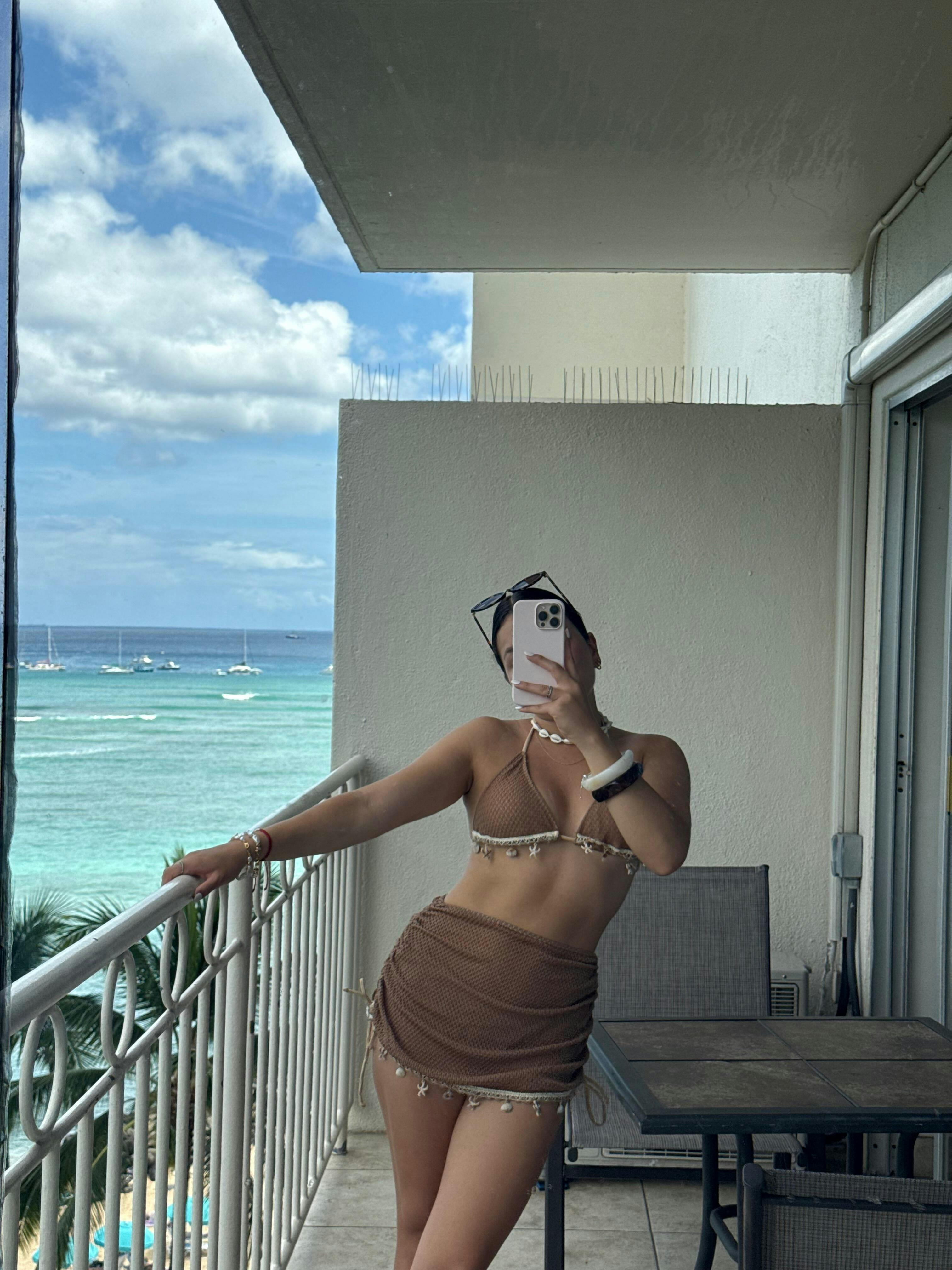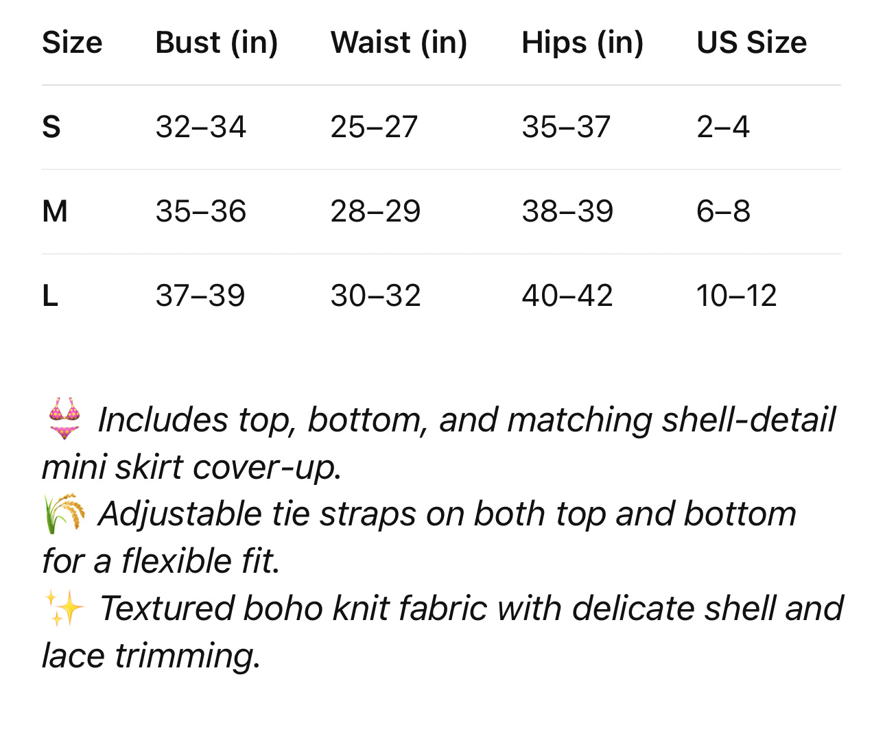 This boho-chic swim set is perfect for beach days filled with sunshine and effortless style. The textured fabric gives it a relaxed, natural vibe, while the playful seashell and starfish charms along the hem add a unique, ocean-inspired touch. Designed with adjustable ties for a customizable fit, the set offers both comfort and versatility. Whether paired with the matching skirt for a laid-back cover-up look or worn on its own, this piece captures the spirit of carefree coastal living while keeping you polished and chic.