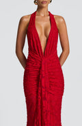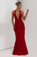 Where elegance meets power — the Rouge Dynasty Gown embodies timeless allure with a bold modern edge. Featuring a deep plunge neckline, ruched detailing that sculpts the silhouette, and a dramatic open back tied gracefully at the neck, this gown redefines evening glamour. The textured fabric adds depth and dimension, catching light with every move. Designed for the woman who commands attention effortlessly.