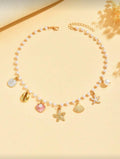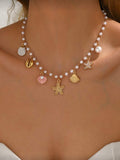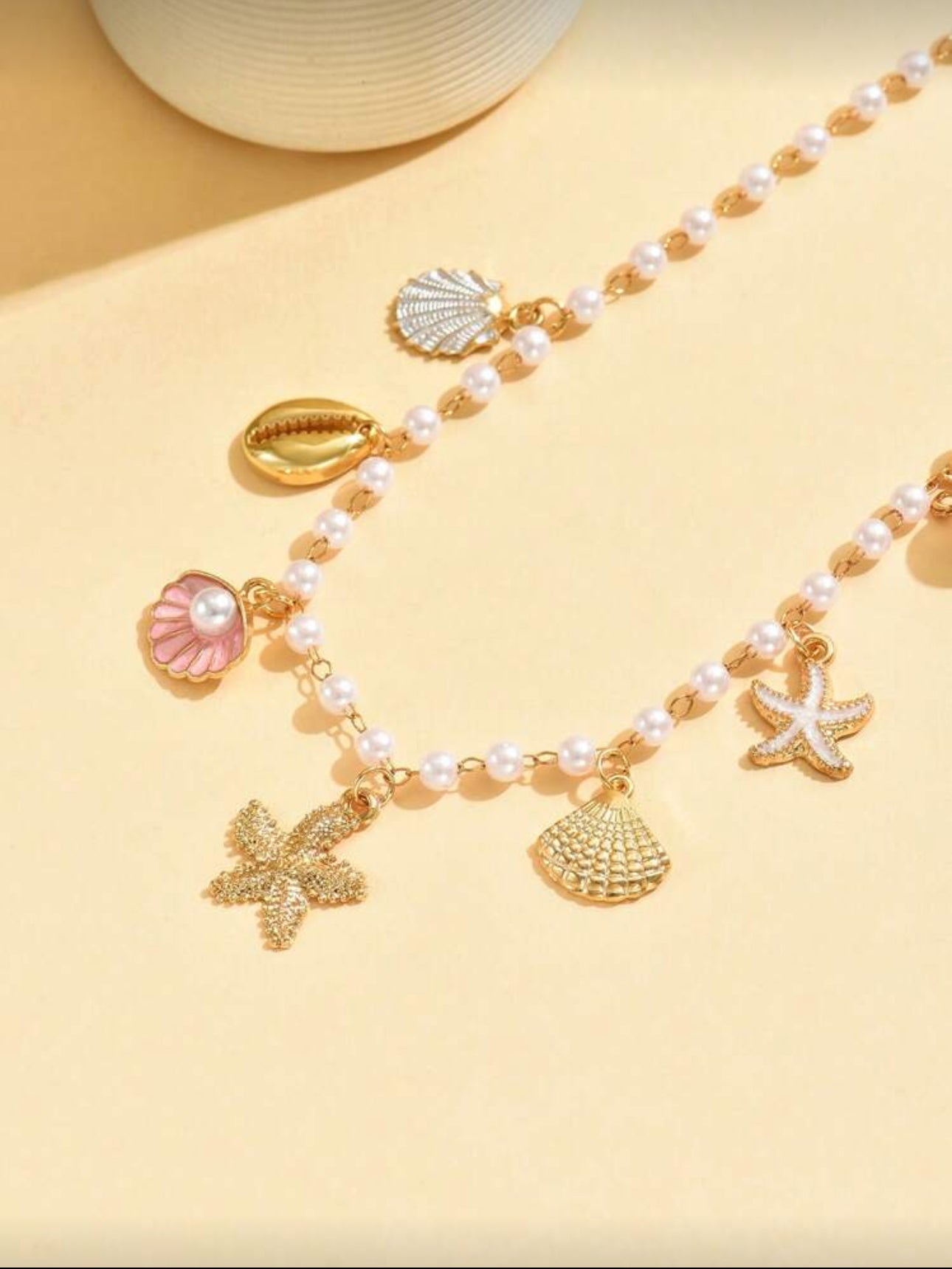 The Seaside Charm Pearl Necklace is a dreamy ode to the ocean, blending coastal beauty with timeless elegance. Designed with lustrous faux pearls and delicate gold detailing, it features an enchanting mix of seashell, starfish, and cowrie charms — each symbolizing the spirit of sunlit shores and carefree wanderlust. A touch of blush enamel adds soft femininity, making it the perfect statement piece for resort days or evening escapes by the sea.