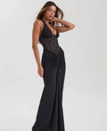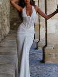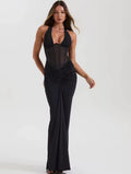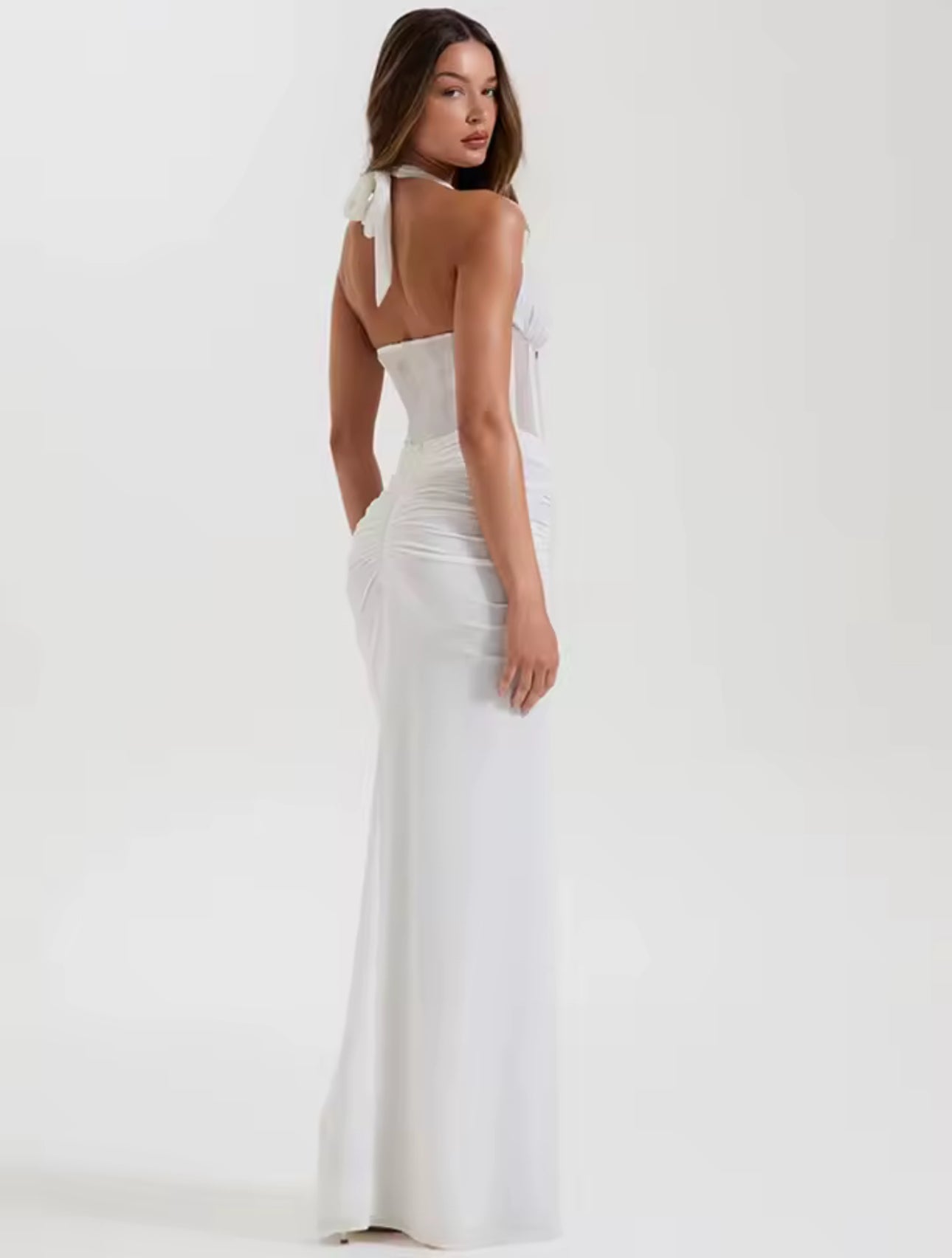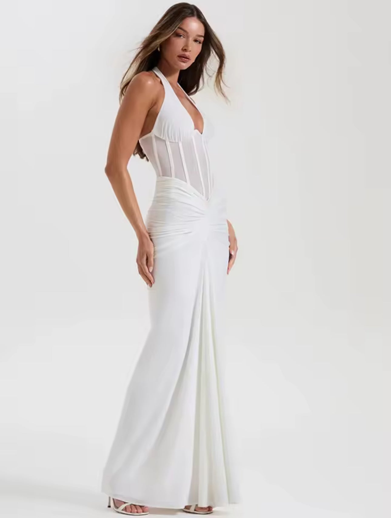 The Seraphina Gown embodies divine elegance with a modern edge. Featuring a sculpted halter neckline and a sheer corset bodice that contours to perfection, it celebrates the feminine silhouette in its purest form. The ruched waistline accentuates natural curves, flowing into a graceful floor-length skirt that moves like liquid light.