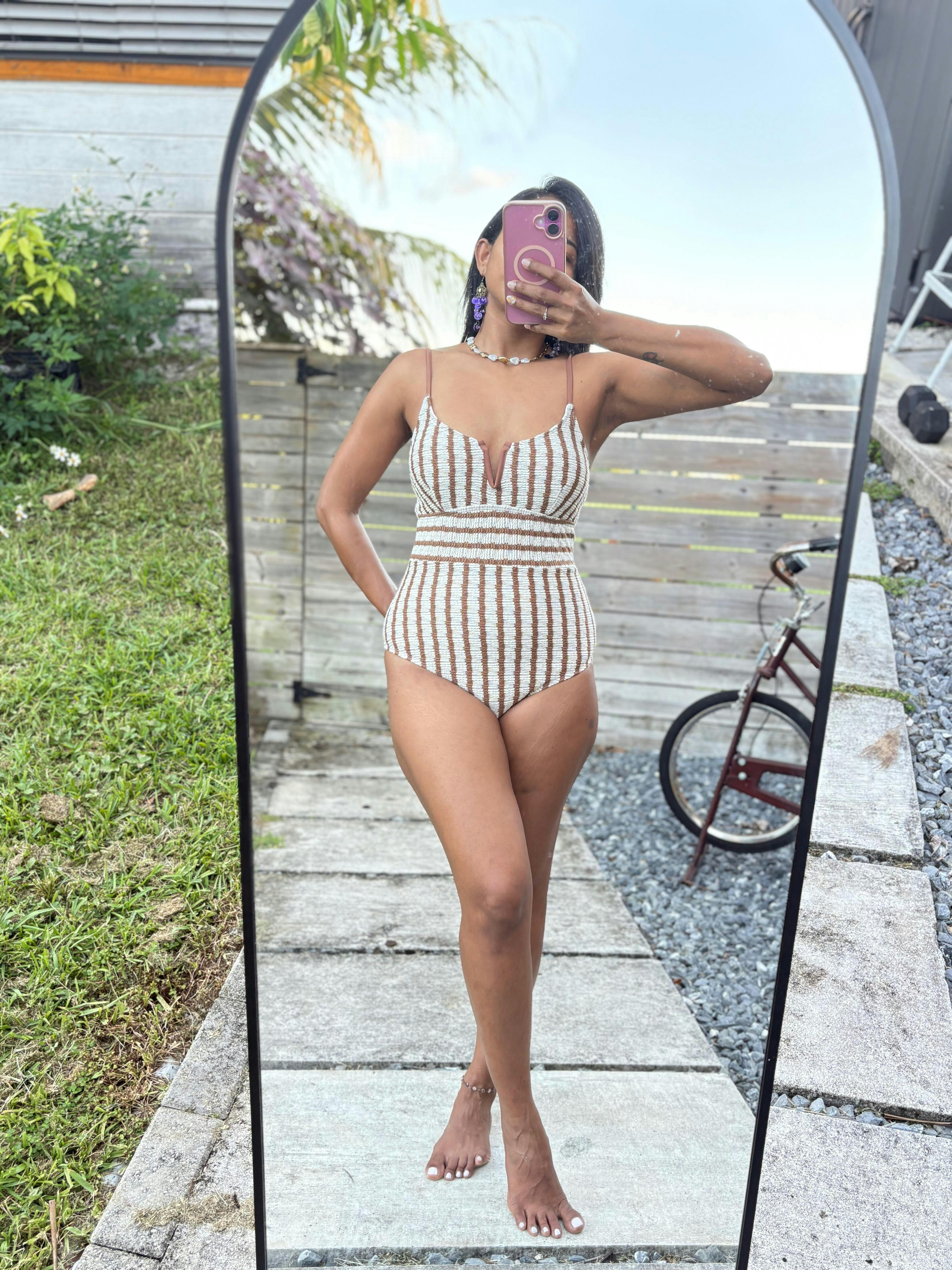 This one-piece swimsuit combines modern structure with timeless sophistication. Featuring bold vertical stripes in earthy brown and cream, it elongates the silhouette while offering a flattering cinched waist effect. The plunging neckline with a subtle V-bar insert adds a daring touch, balancing elegance with allure. Crafted in a ribbed textured fabric, it brings both comfort and style, making it a versatile piece for sun-soaked strolls through coastal towns or lounging by the pool. Effortlessly chic, this swimsuit embodies understated luxury with a refined Mediterranean flair.