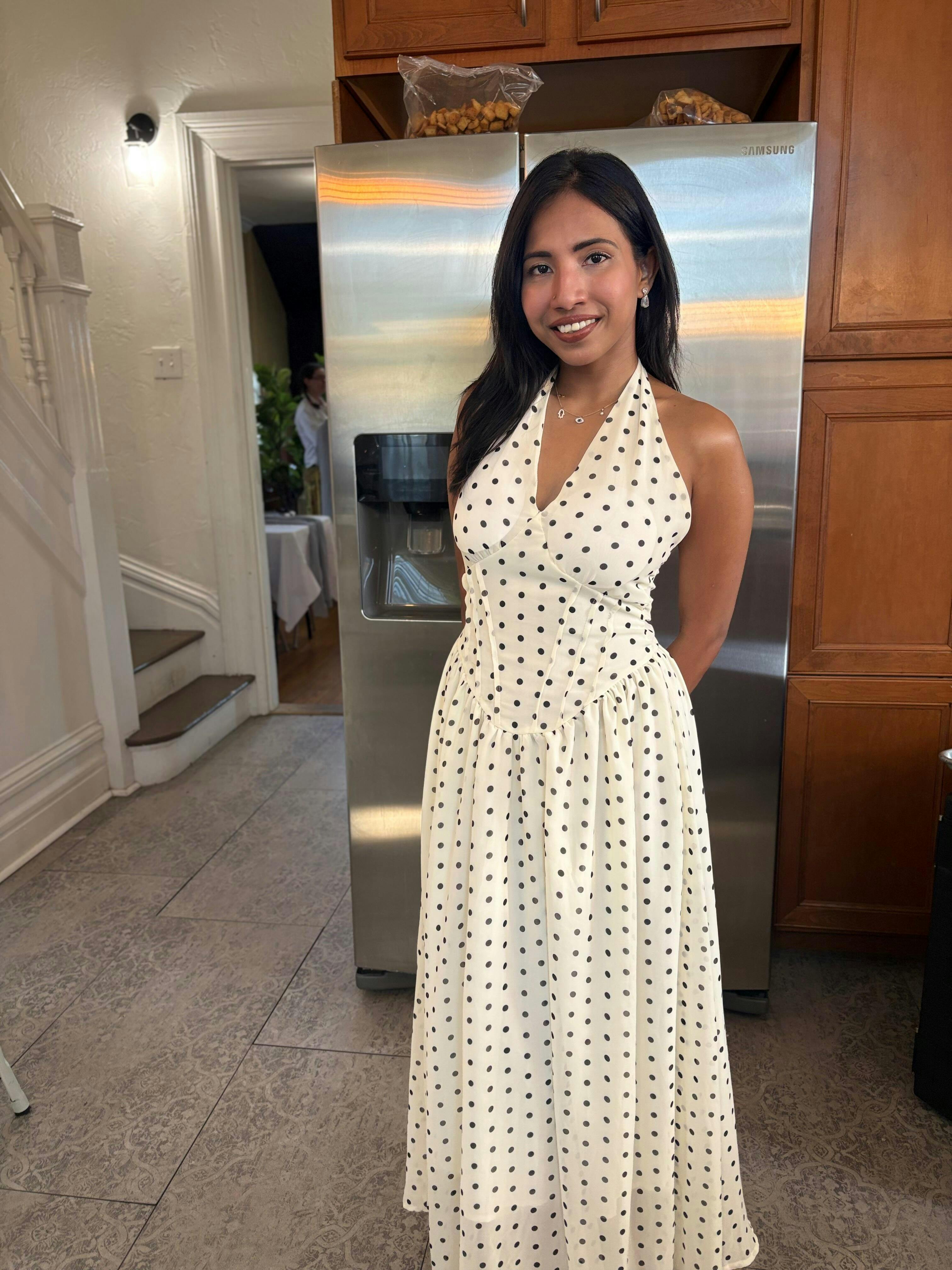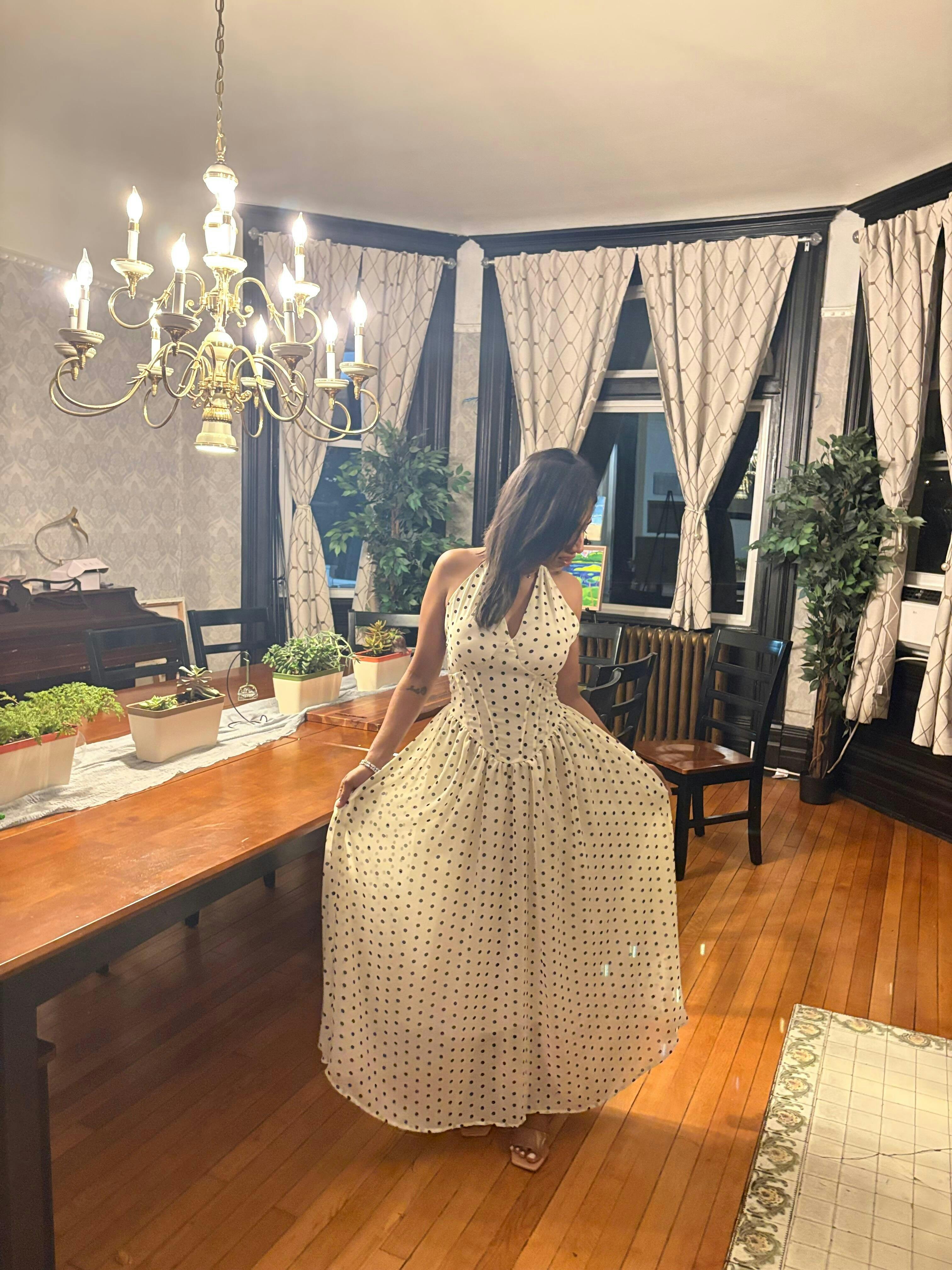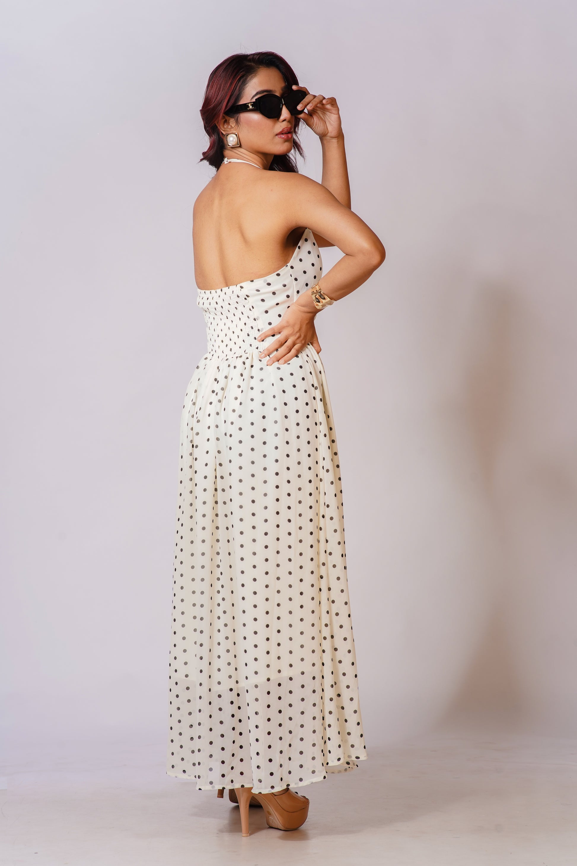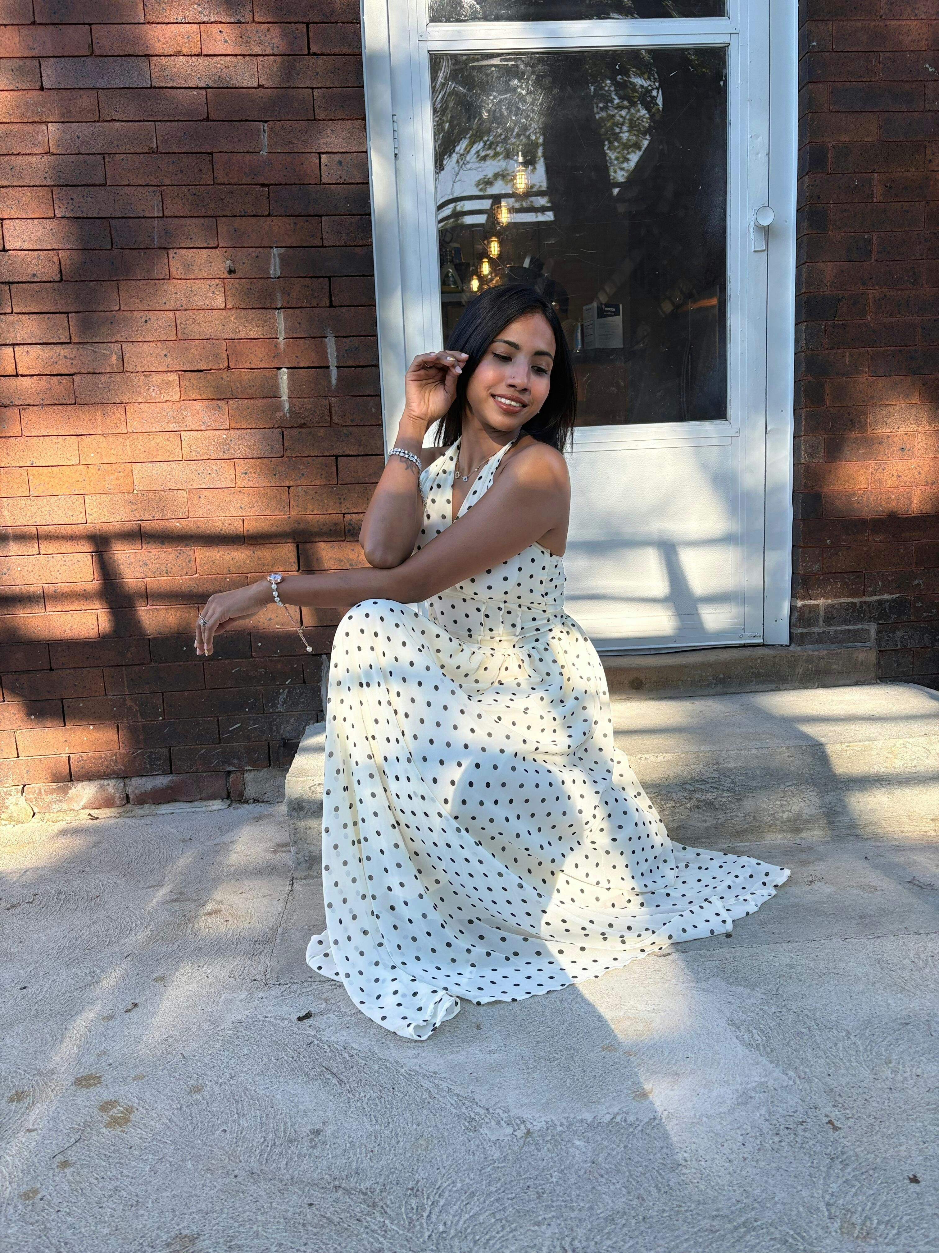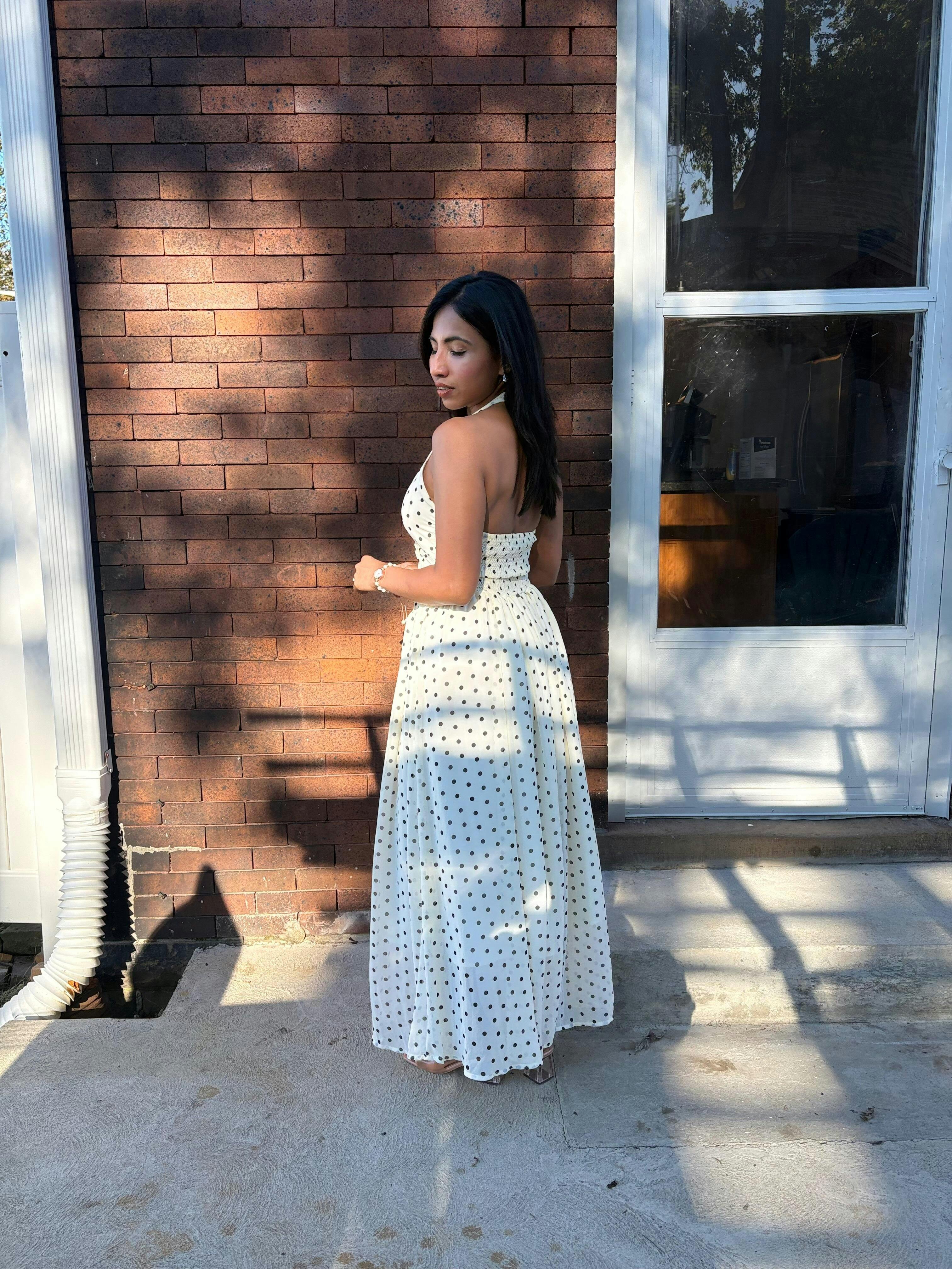Timeless and chic, this polka dot halter midi dress is a modern nod to vintage glamour. Featuring a flattering halter neckline, fitted bodice, and flowing A-line skirt, it combines classic femininity with effortless sophistication. The playful polka dot print brings a touch of retro charm, while the midi length keeps it versatile for day or evening wear. Perfect for Parisian cafés, summer strolls, or elegant gatherings.