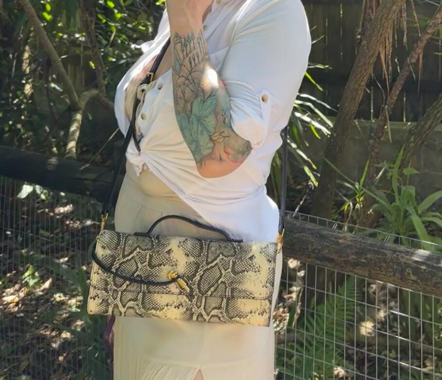 Sleek and powerful, the Viper Luxe Clutch elevates your evening wardrobe with bold sophistication. Its snakeskin texture and structured rectangular design make it the ultimate versatile accessory — equally at home with a polished cocktail dress or chic black maxi. Finished with a subtle gold accent, this clutch is a timeless piece with modern edge.