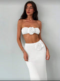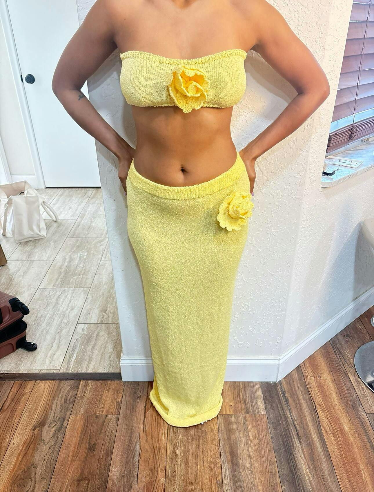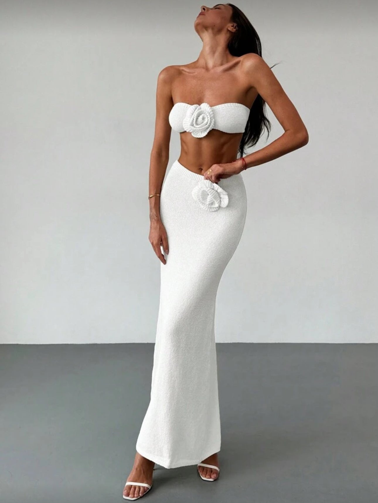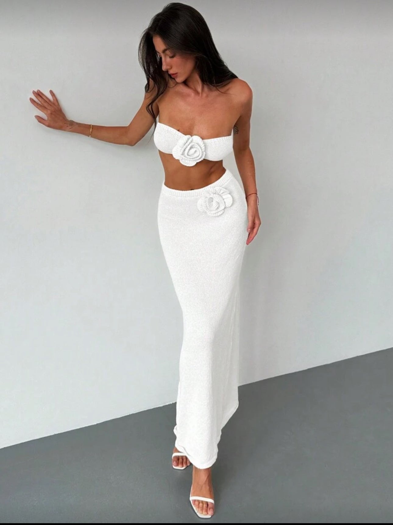 Effortless elegance with a bold touch — this knit two-piece set features a bandeau top and matching high-waist maxi skirt, both adorned with a statement floral appliqué. Designed to flatter with its textured stretch knit and elongating silhouette, it’s perfect for sunlit escapes, yacht days, or evening soirées.