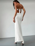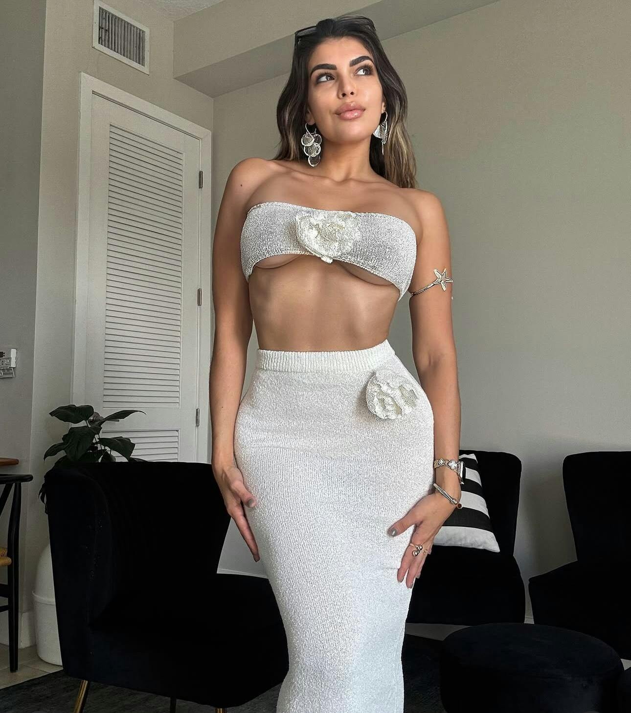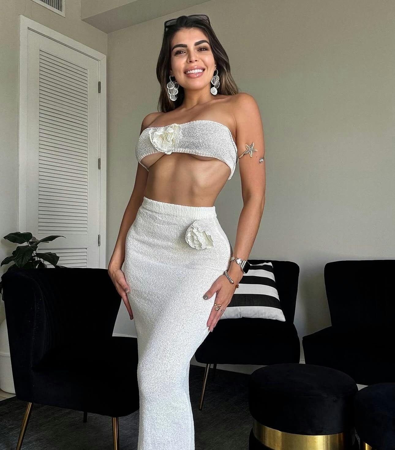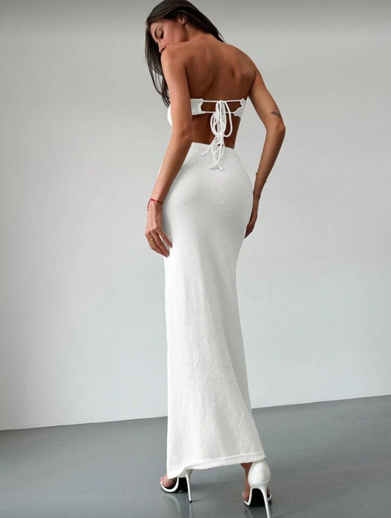 Effortless elegance with a bold touch — this knit two-piece set features a bandeau top and matching high-waist maxi skirt, both adorned with a statement floral appliqué. Designed to flatter with its textured stretch knit and elongating silhouette, it’s perfect for sunlit escapes, yacht days, or evening soirées.